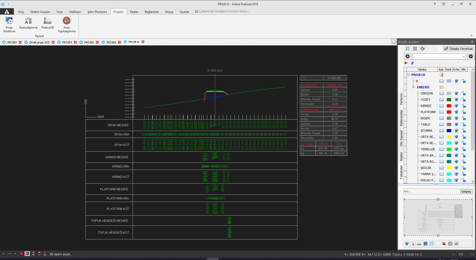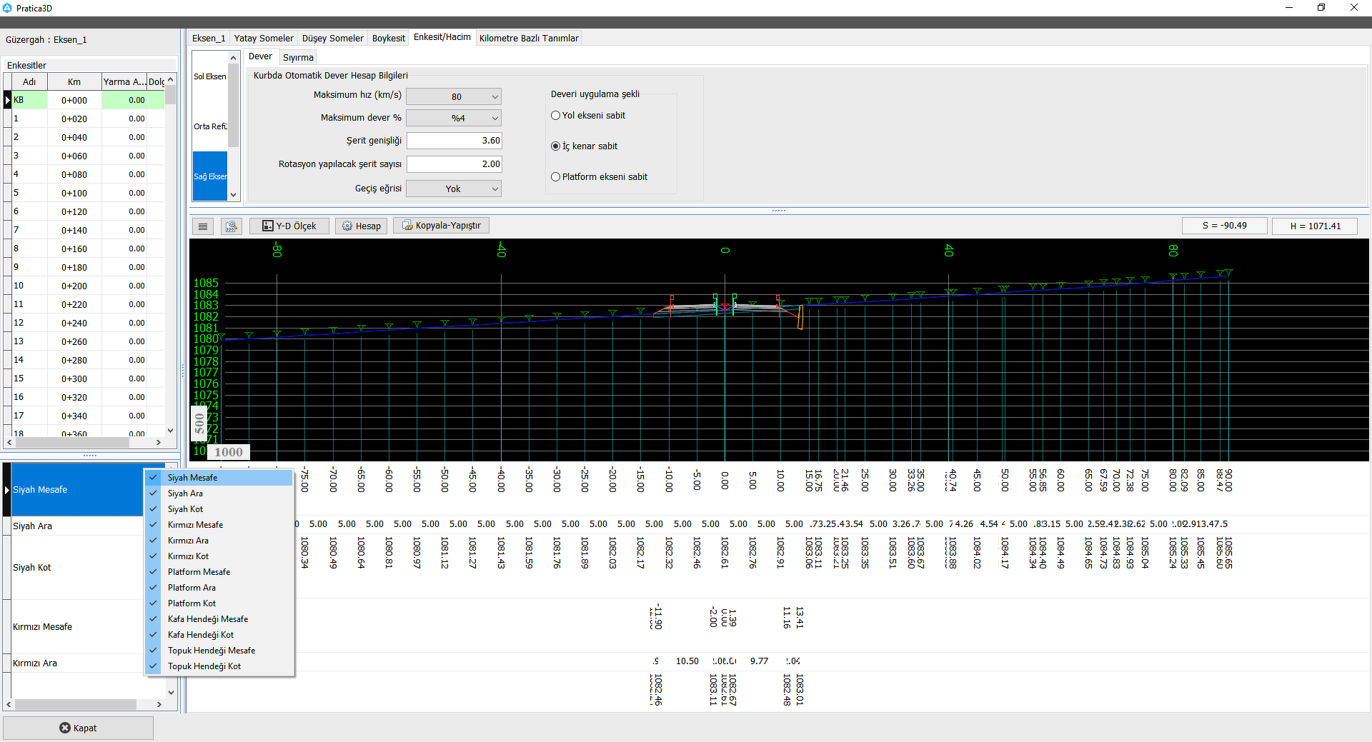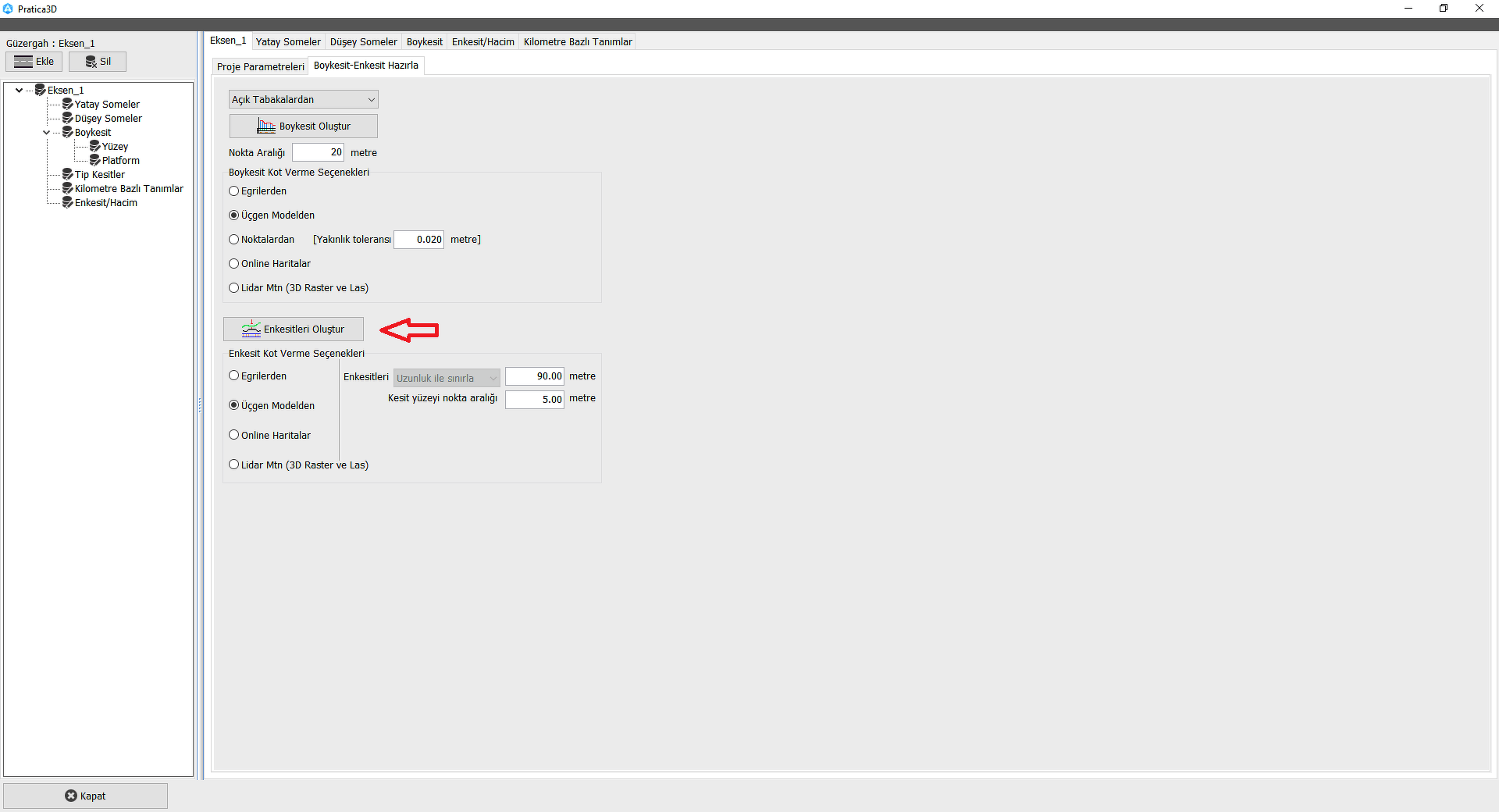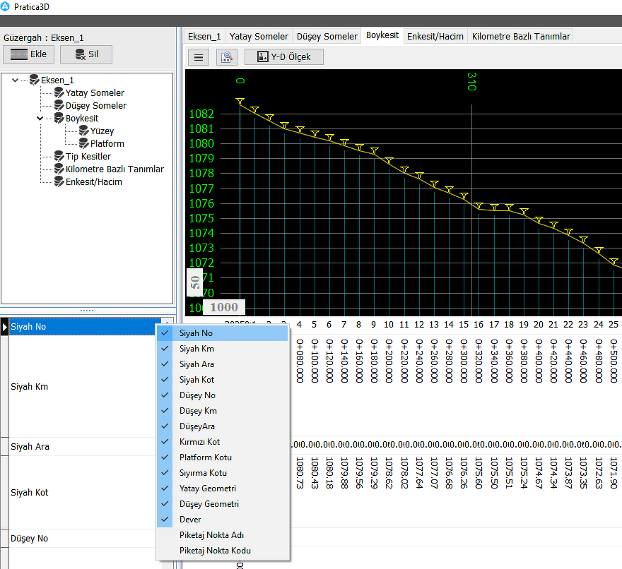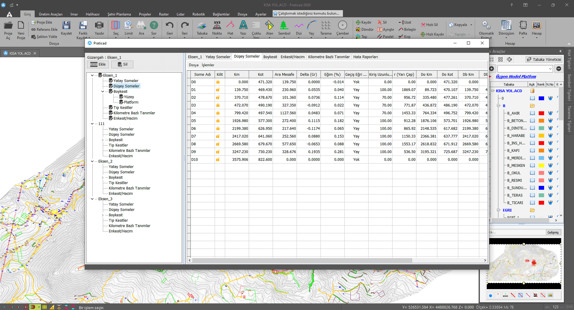 Praticad, yarma, dolgu, metraj maliyetleri ile geometrik kriterlere göre (min. aliyman ve maks. eğim) en düşük maliyetli proje hattını (kırmızı) oluşturmak için çalışır. Örneğin yarma maliyeti 3 dolgu maliyeti 1 olur ise yarmanın maliyeti dolgudan fazla olduğu için yarmayı azaltmaya çalışır (belirlediğiniz geometrik kriterlere göre).